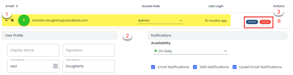 - Hacer clic para aprobar/rechazar un nuevo usuario