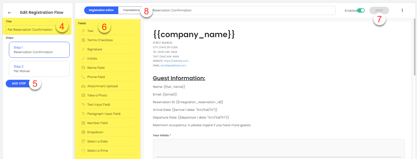 - En la pestaña del editor de registro, haz clic en los campos que deseas añadir a este flujo de registro - puedes añadir tantos campos (pasos) como quieras. Opciones de campo: