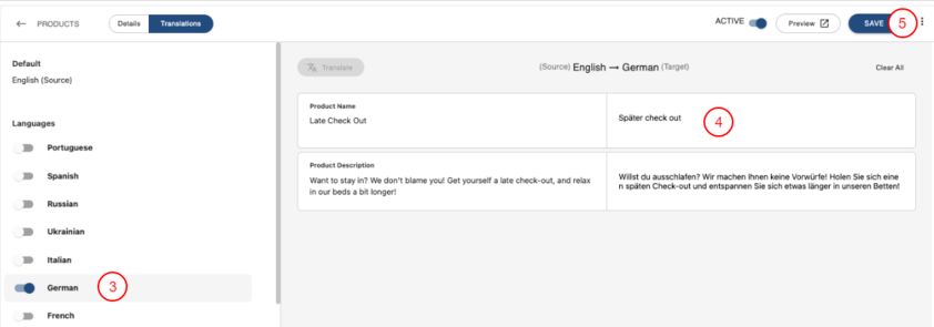 La función Upsell permite a los clientes agregar traducciones para hasta 29 idiomas, de modo que cuando los huéspedes vean la tienda de Upsell, puedan seleccionar el idioma que prefieran.