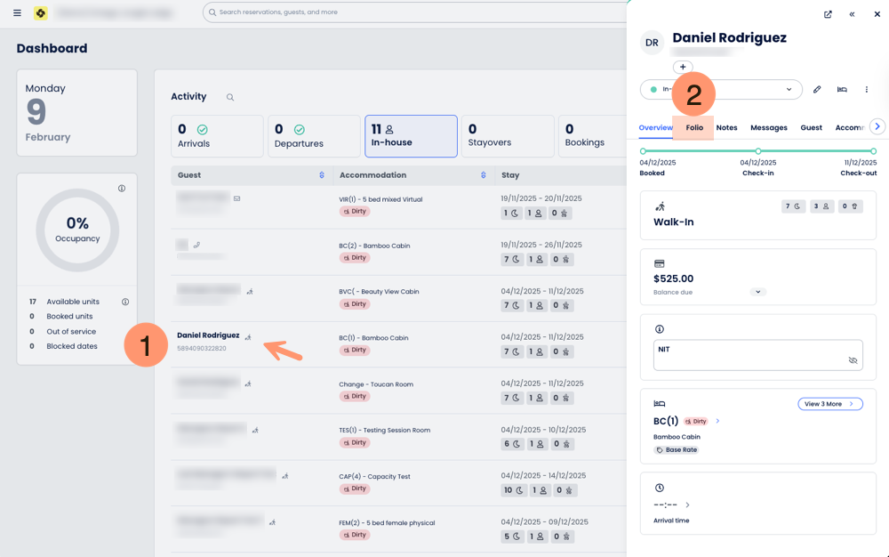 1. No Painel de Controle do PMS da Cloudbeds, clique no nome do hóspede/número da reserva;
