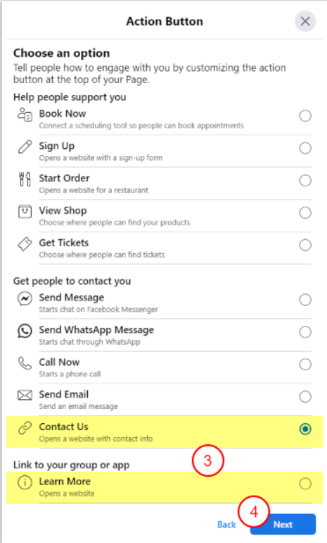 - Selecione um Botão de Ação. Escolha Entrar em Contato ou Saiba mais (na seção Link para seu grupo ou aplicativo), pois eles permitem que você vincule a um site;