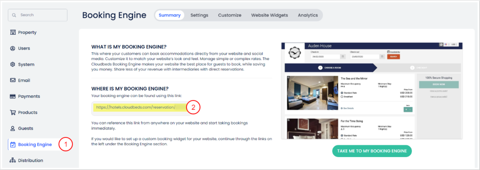 - Na guia Resumo, copie seu URL do Motor de Reservas.