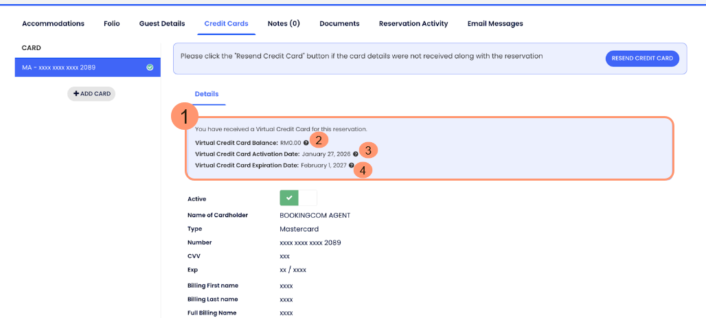 - Abra a reserva correspondente cujos detalhes do cartão de crédito serão editados e clique na guia Cartões de Crédito. Se a reserva tiver vários cartões adicionados, selecione o cartão que deseja editar;