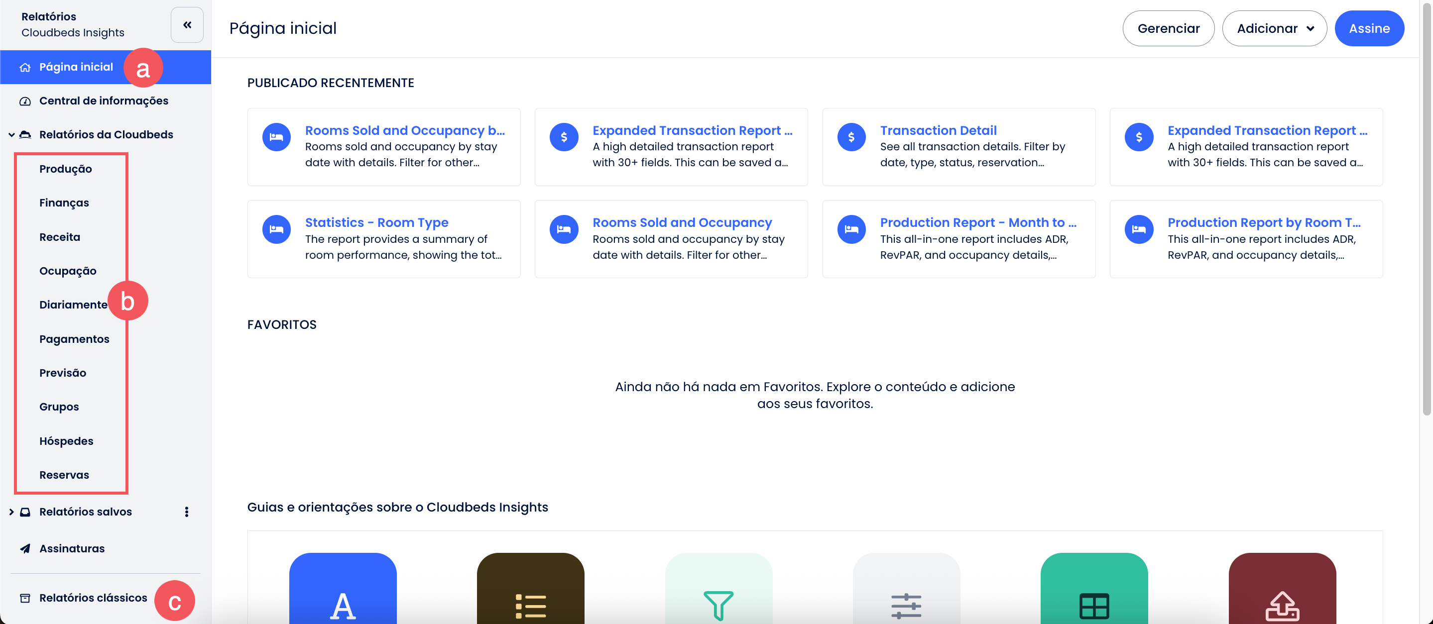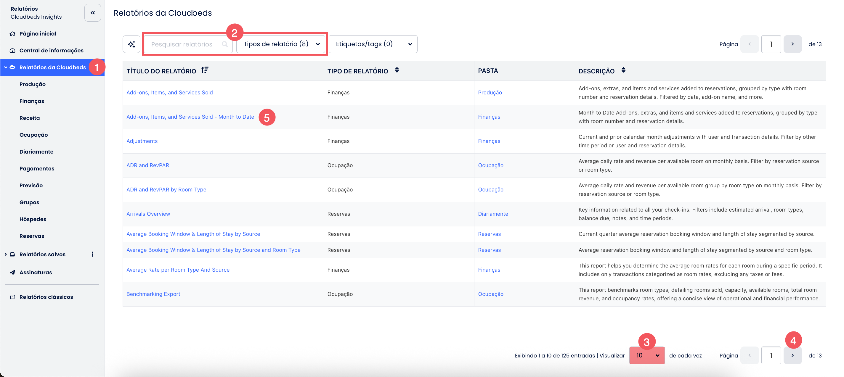 - Clique em Relatórios da Cloudbeds para visualizar a lista disponível. Esta lista continuará a crescer ao longo do tempo;