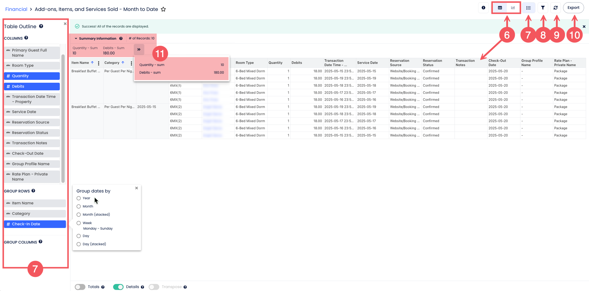 Por exemplo, clique em Data de Check-in em Agrupar Linhas para agrupar os dados por ano, mês, mês (empilhado), semana, segunda-feira - domingo, dia ou dia (empilhado).