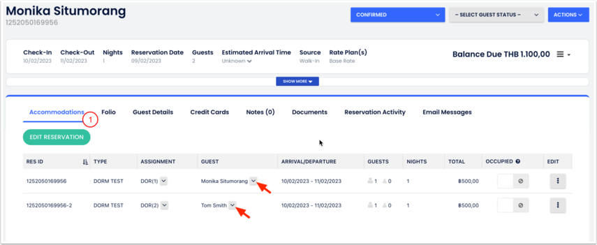 - Na guia de Acomodações, verifique se os quartos estão alocados sob o nome correto do hóspede;