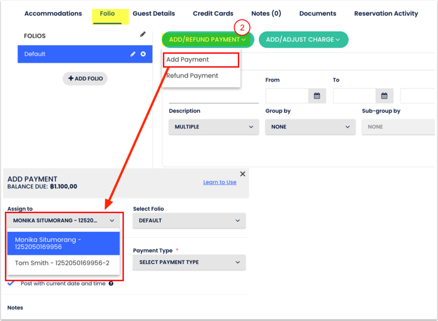 - Ao adicionar um item ou pagamento ao extrato, atribua-o ao hóspede correto;