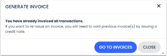 Se não houver nenhuma transação restante para ser faturada, a seguinte mensagem de erro será exibida. Para reemitir uma fatura, confira: Emissão Avançada de Faturas - Como anular uma fatura e emitir uma nota de crédito.