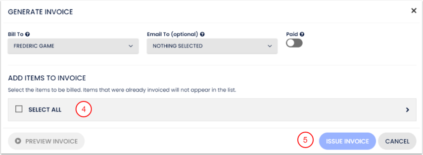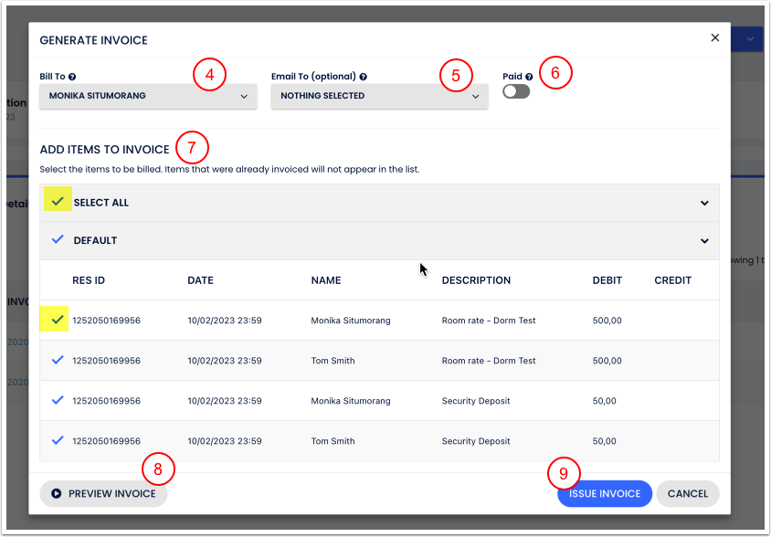 - Selecione um ou mais hóspedes para receber a fatura que você está criando (opcional);