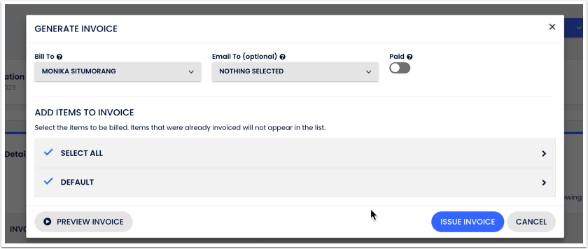 Itens que já foram faturados não serão exibidos na lista. Se você faturou acidentalmente um item errado, deve anular a fatura e criar uma Nota de Crédito. Isso liberará todas as transações incluídas na fatura. Saiba mais: Emissão Avançada de Faturas - Como anular uma fatura e emitir uma nota de crédito