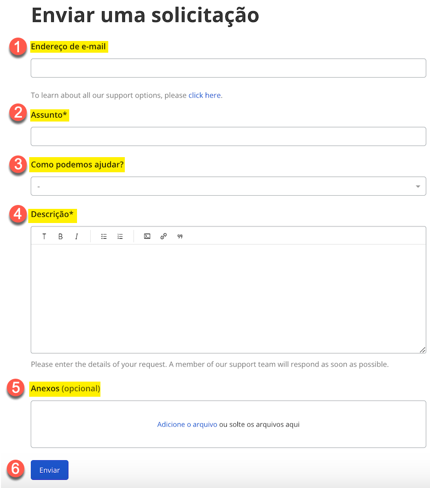 Acesse esta página para enviar um e-mail e entrar em contato com nossa equipe de suporte, preenchendo todos os campos disponíveis: