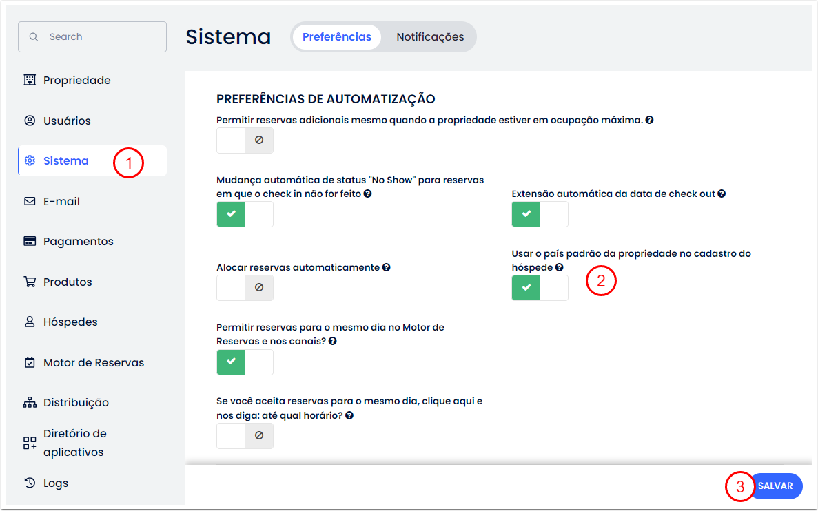 - Ativado - todas as reservas criadas manualmente terão o campo de país preenchido com o país da propriedade.