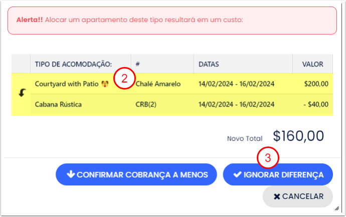 - Sua equipe tem a opção de ignorar a diferença nas cobranças ou confirmar o novo preço. Para alterar a reserva para um novo tipo de acomodação sem cobrança, clique no botão ignorar a diferença