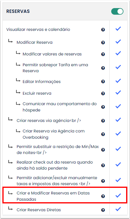 Para verificar essa permissão, faça login como Proprietário da Propriedade, acesse a página de Papéis de Usuário e edite a função atribuída ao usuário específico. Procure pela permissão Criar e modificar reservas em datas passadas e habilite-a para o usuário, se necessário: