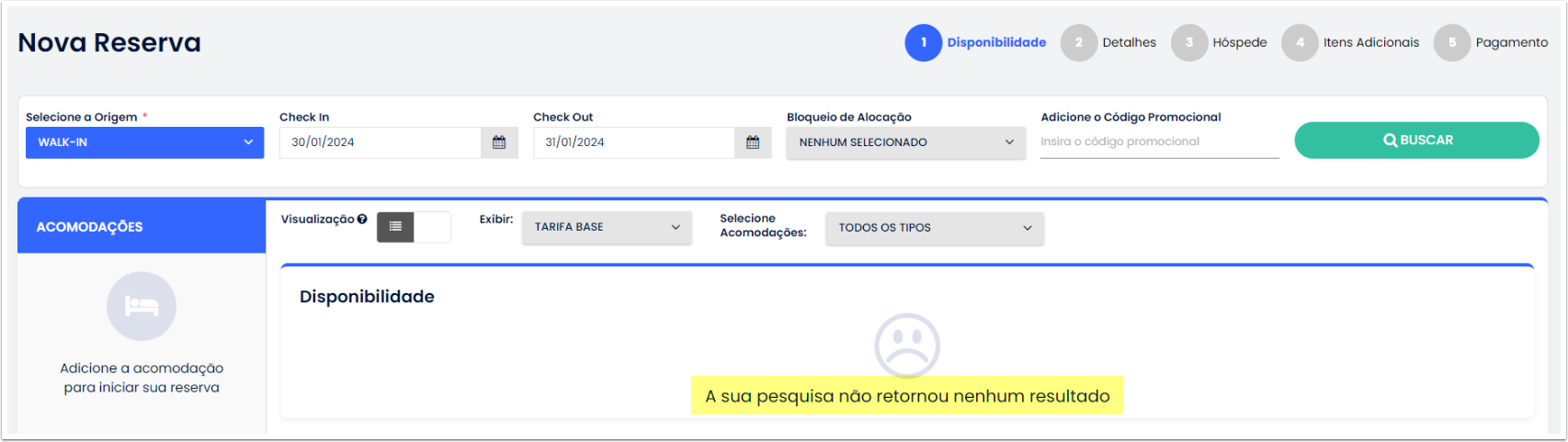 Usando as origens de reservas diretas, o sistema procurará disponibilidade que corresponda aos requisitos definidos pela propriedade. Se houver restrição de estadia mínima ou máxima definida nos intervalos de tarifa e as datas inseridas não atenderem a esses critérios, o usuário receberá a mensagem de indisponibilidade.