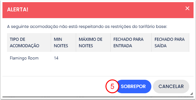 - Aparecerá uma mensagem de aviso informando que essa reserva não atende às restrições definidas pela sua propriedade. Selecione sobrepor para prosseguir