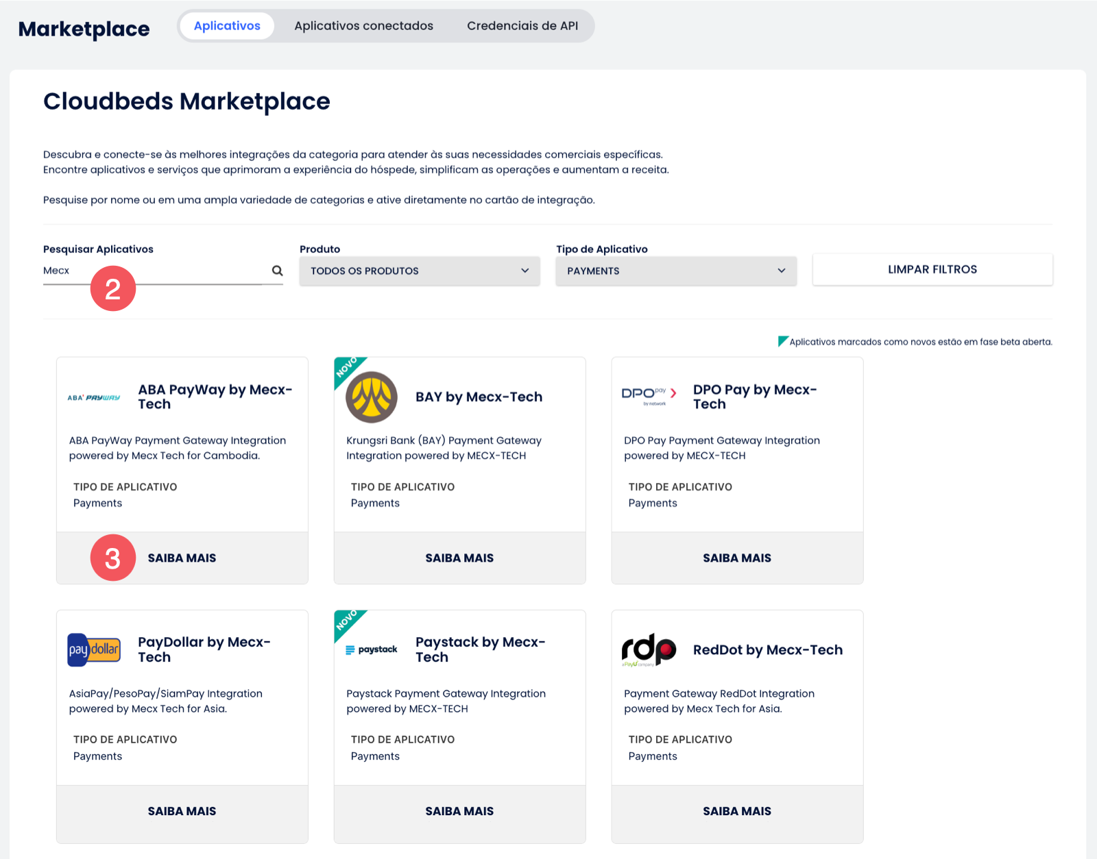 - Busque por Mecx-Tech, ou o parceiro de pagamento específico, na barra de pesquisa;