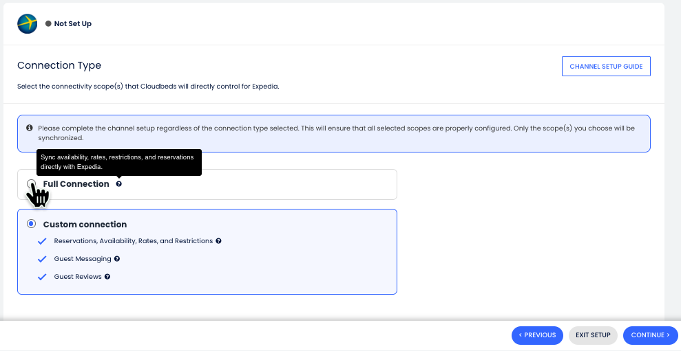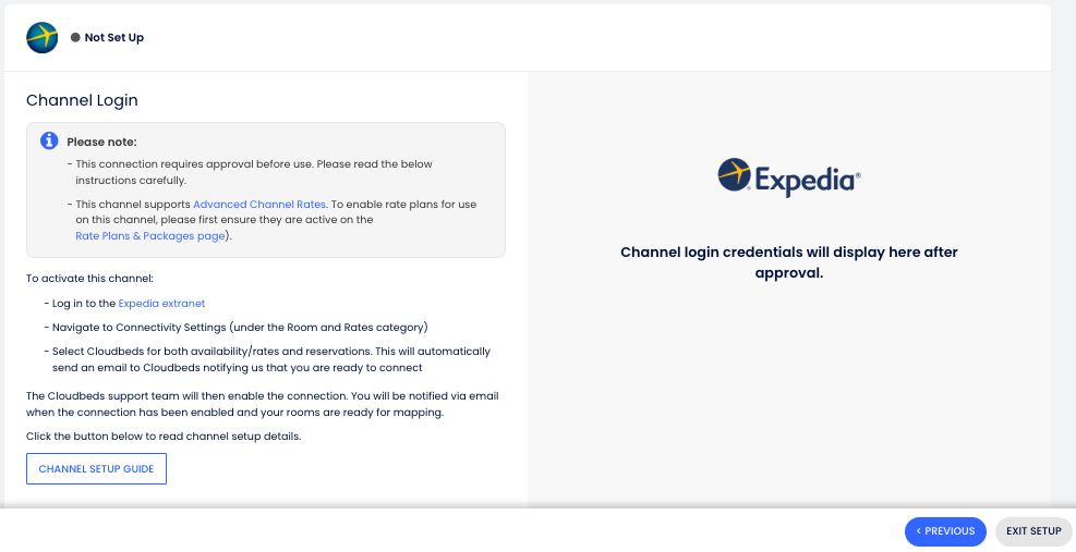 - Se estiver optando por uma conexão completa por meio do PMS da Cloudbeds, certifique-se de que não esteja conectado a outro Gerenciador de Canais no Expedia antes de continuar.