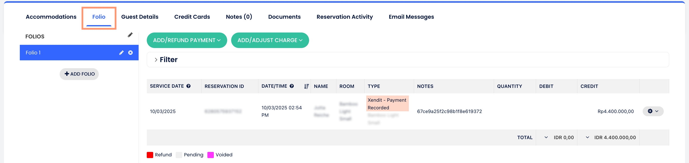 Após o pagamento ser concluído com sucesso, o Xendit registrará a transação no extrato da reserva e atualizará o status de “Aguardando confirmação” para “Confirmado”. O pagamento também constará na guia de atividade da reserva.