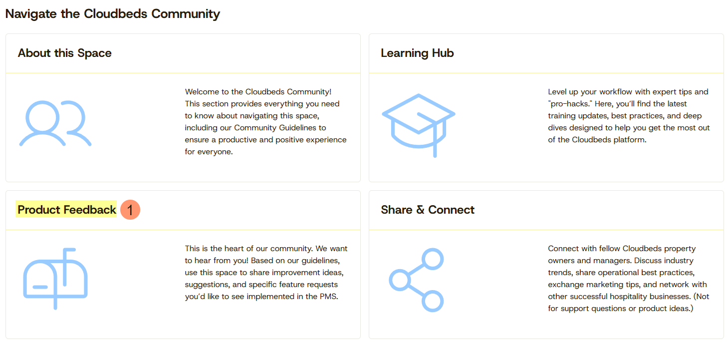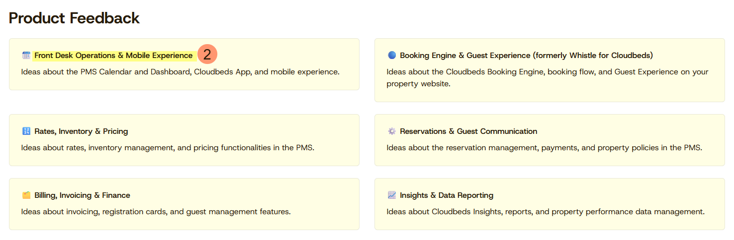 - Comentários sobre os Produtos (Product Feedback): Compartilhe suas ideias sobre os produtos da Cloudbeds. Use este espaço para nos dizer o que podemos melhorar e quais recursos você gostaria de ver a seguir.