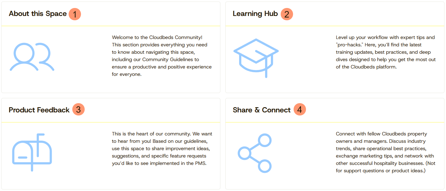 - Sobre este Espaço (About this Space): Esta seção de boas-vindas apresenta brevemente a Cloudbeds Community e inclui guias úteis para todos os usuários, incluindo as diretrizes da comunidade e as perguntas mais frequentes.