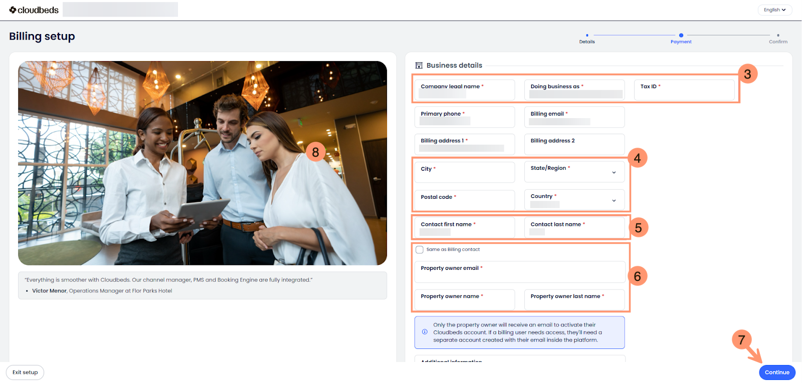 - Os campos de nome e sobrenome serão preenchidos automaticamente a partir da conta do sistema, mas podem ser ajustados para fins de faturamento caso o contato de faturamento seja diferente das informações do titular da propriedade.