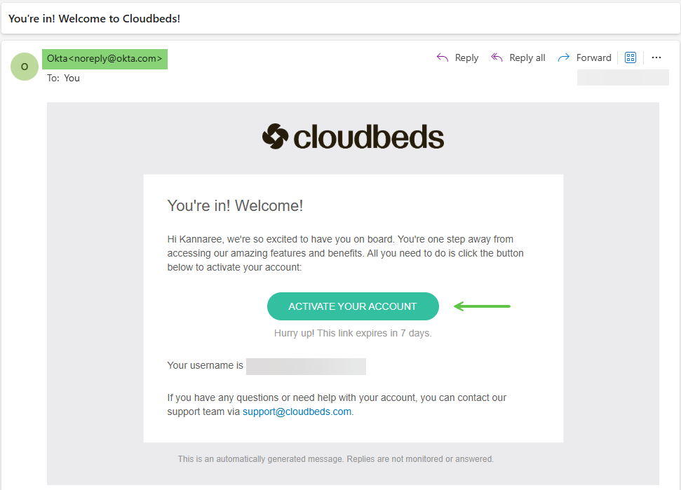 Antes de configurar sua conta de faturamento, ative sua conta de usuário abrindo o e-mail da Okta com o assunto “Você está dentro! Bem-vindo(a) à Cloudbeds!”.