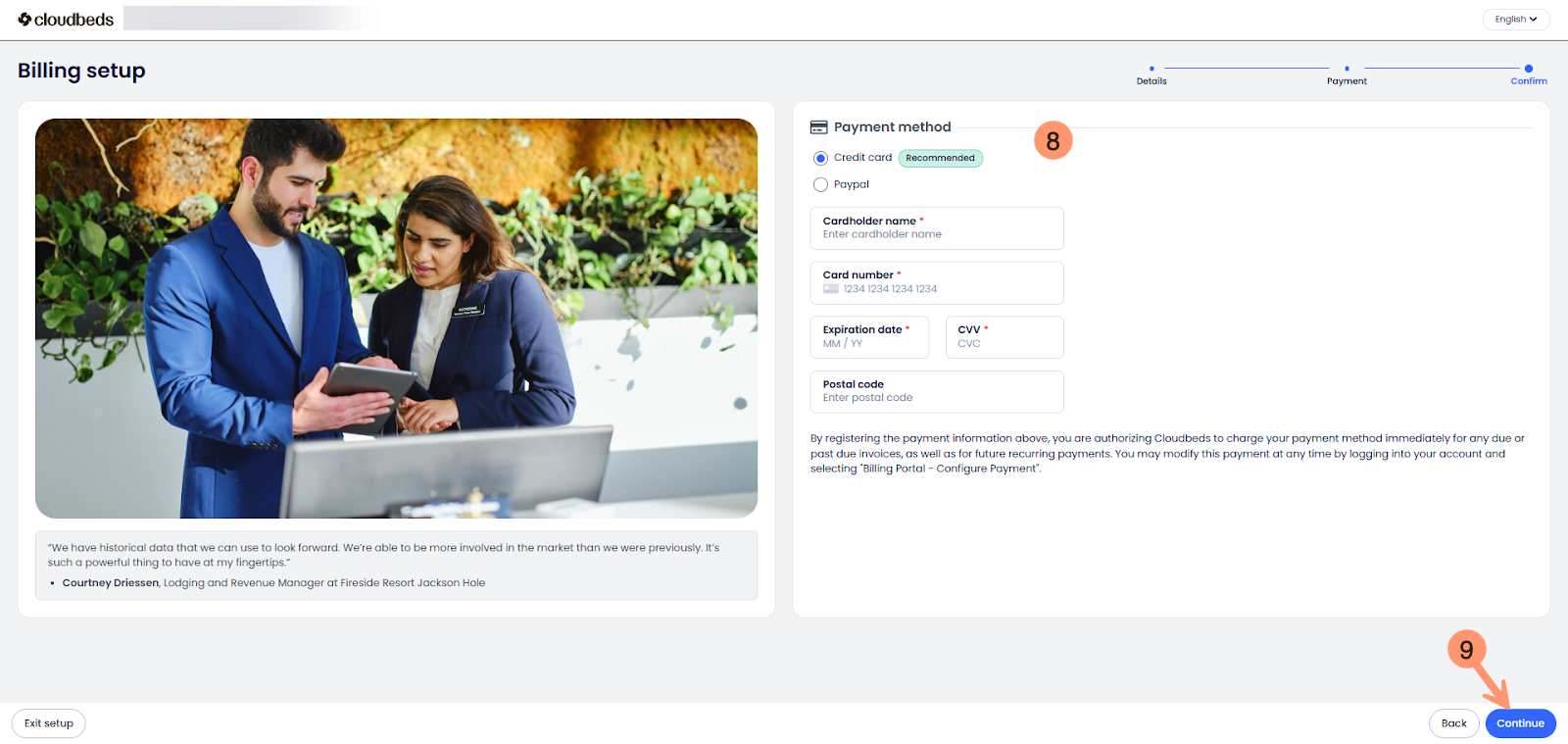 Ao registrar as informações de pagamento, você autoriza a Cloudbeds a cobrar sua forma de pagamento imediatamente por quaisquer faturas vencidas ou em atraso, bem como por pagamentos recorrentes futuros.