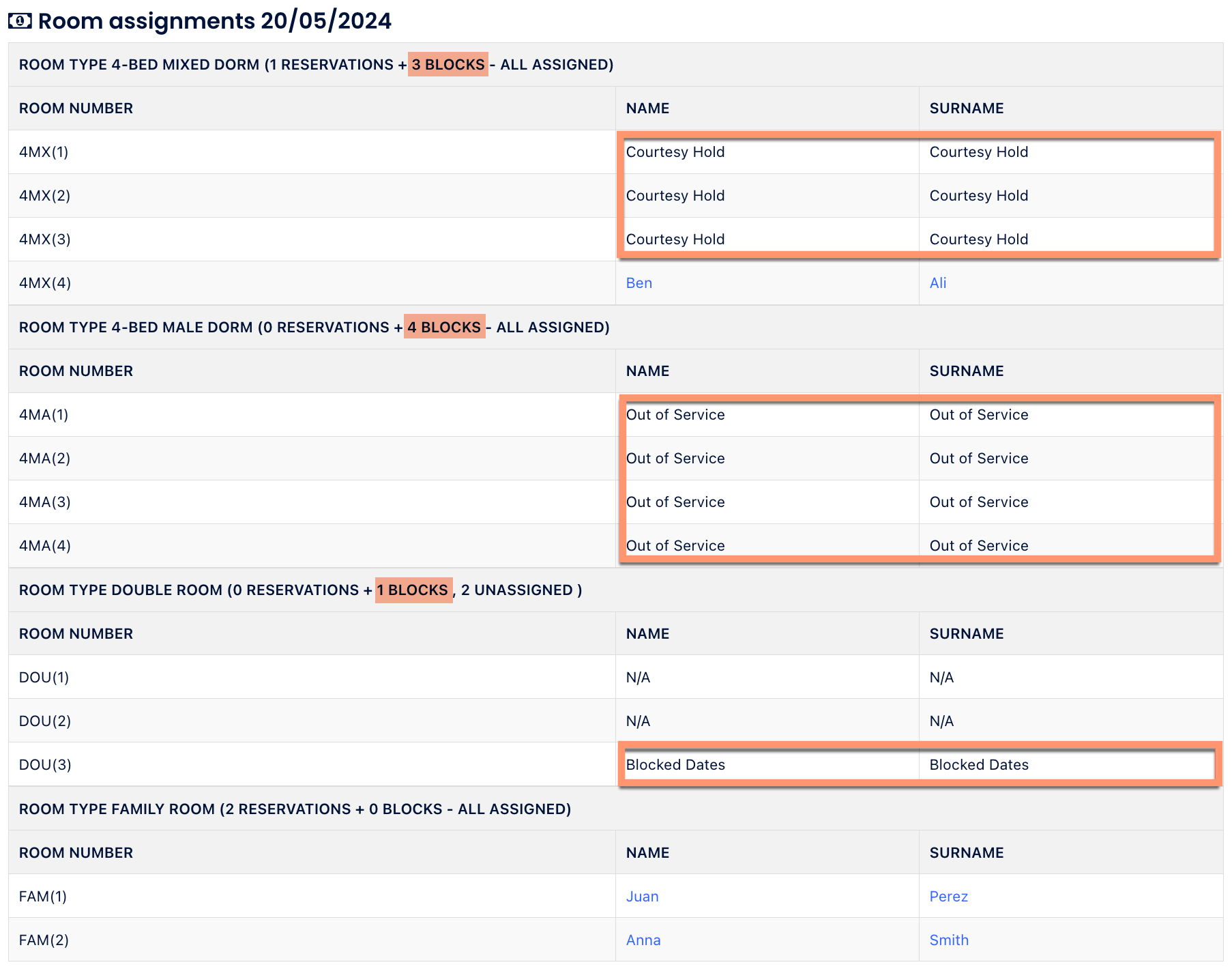 Esses termos serão mostrados nos campos Nome e Sobrenome e no número total de bloqueios na linha Tipo de Acomodação (Reservas + Bloqueios, Não designados).