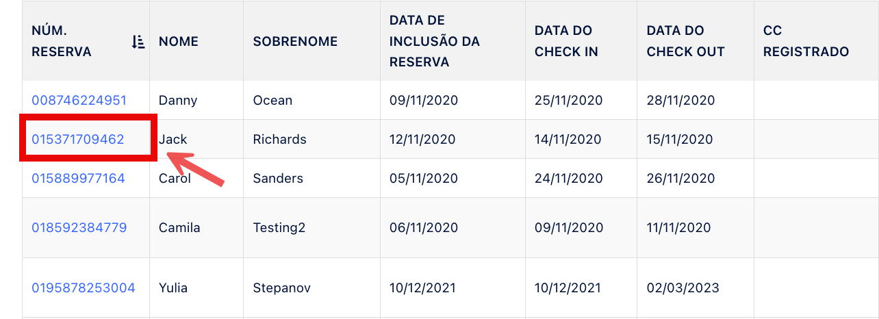 Clique no texto hiperlinkado na coluna Nº da Reserva para ser redirecionado para a página de Detalhes da reserva.