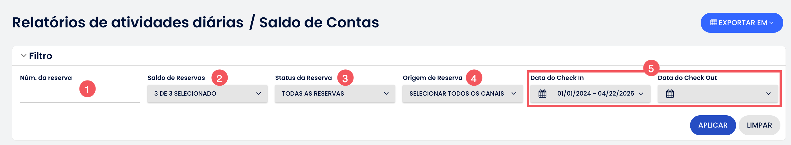 5. Data de Check-in e Data de Check-out: Refine sua busca por uma data específica ou por um intervalo de datas. Deixe em branco para ver uma lista completa de todas as suas reservas;