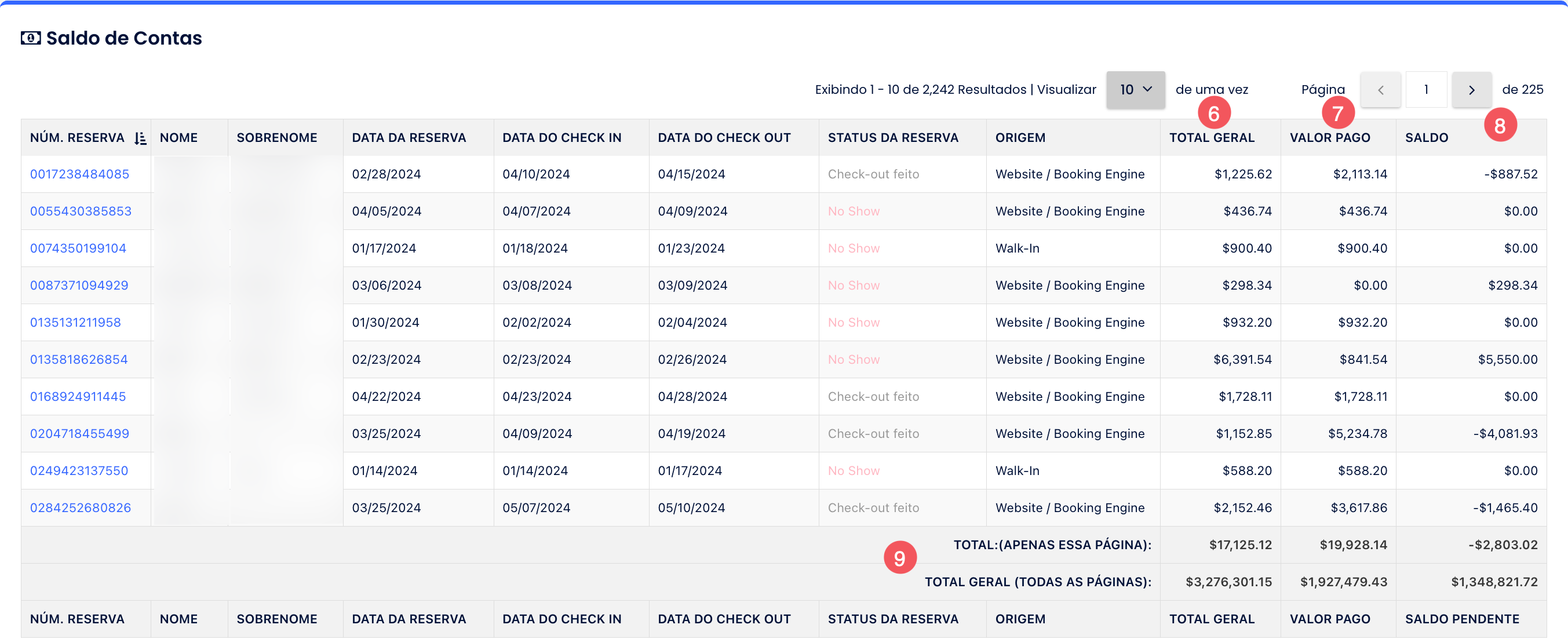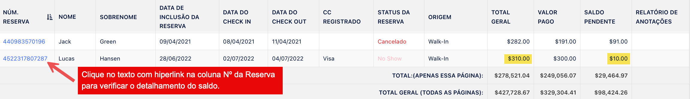• A coluna Saldo neste relatório utiliza o mesmo cálculo unificado de Saldo Devido observado no extrato de reserva, nos extratos de Grupo e nas contas internas. O valor é sempre calculado com base em todas as transações, lançadas ou pendentes.
