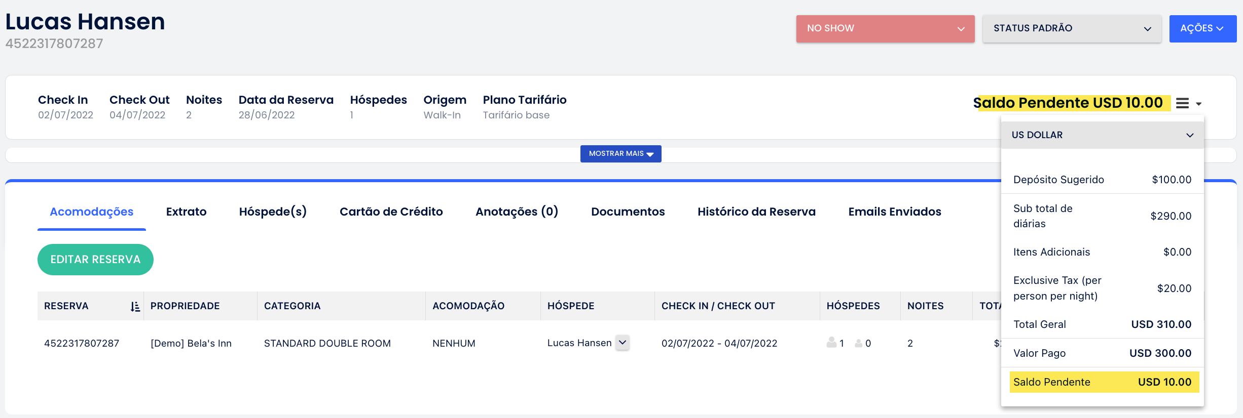 • Saldo Devido ou Saldo Positivo: O hóspede deve dinheiro a você.