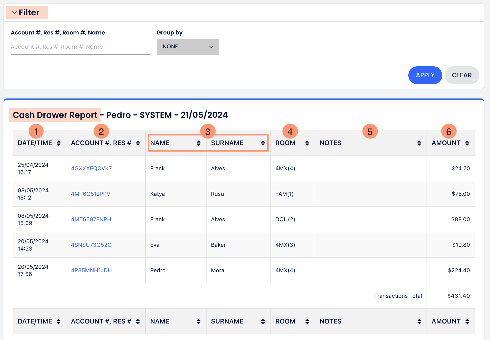 Role para baixo para verificar todas as transações em dinheiro relacionadas à gaveta. Você pode filtrá-las por Número da Conta, Número da Reserva, Número do Quarto, Nome.