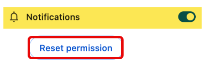 Você pode redefinir suas permissões de notificação clicando no botão abaixo das configurações de Notificação. Ao clicar, o navegador solicitará uma atualização e exibirá uma janela pedindo permissão para enviar notificações novamente.