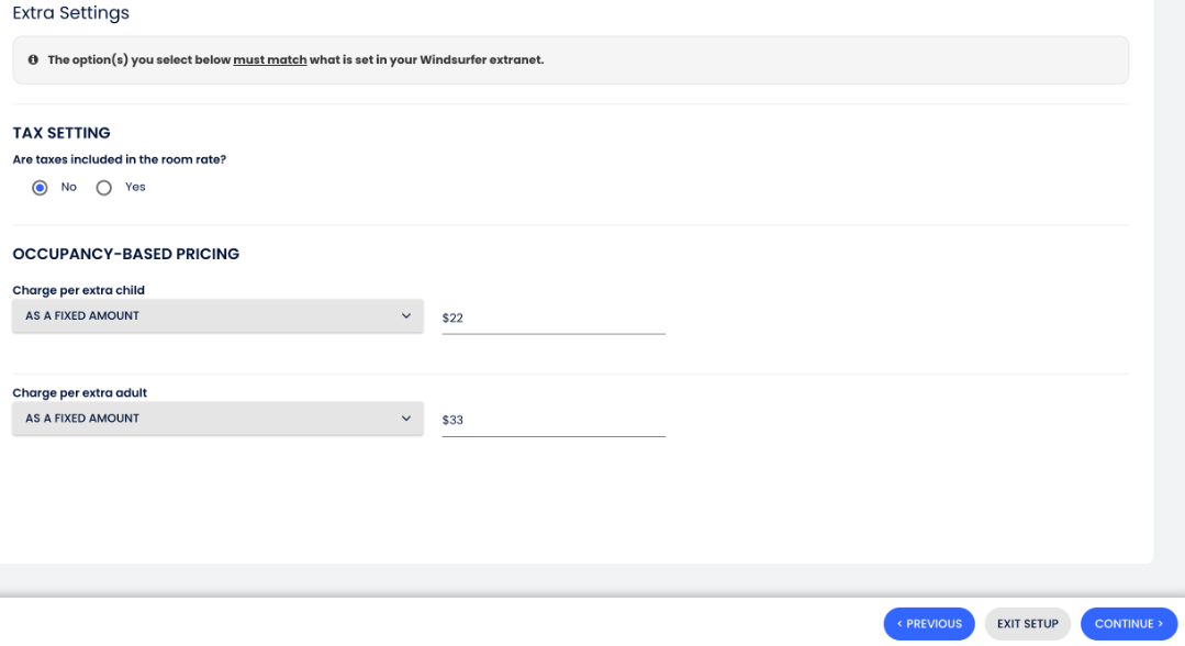 - Adicione um Ajuste de Tarifa Base para cada tipo de acomodação (se necessário). Quando concluído, clique em Continuar, ou deixe em zero se desejar pular;