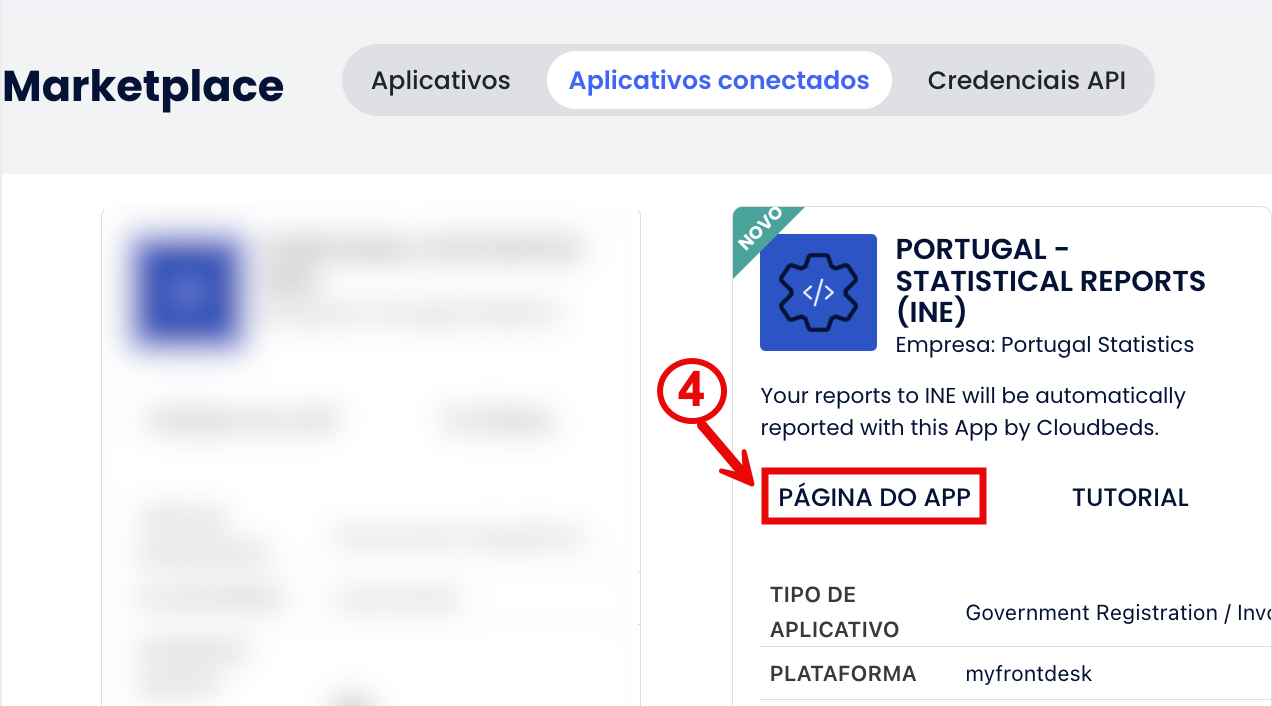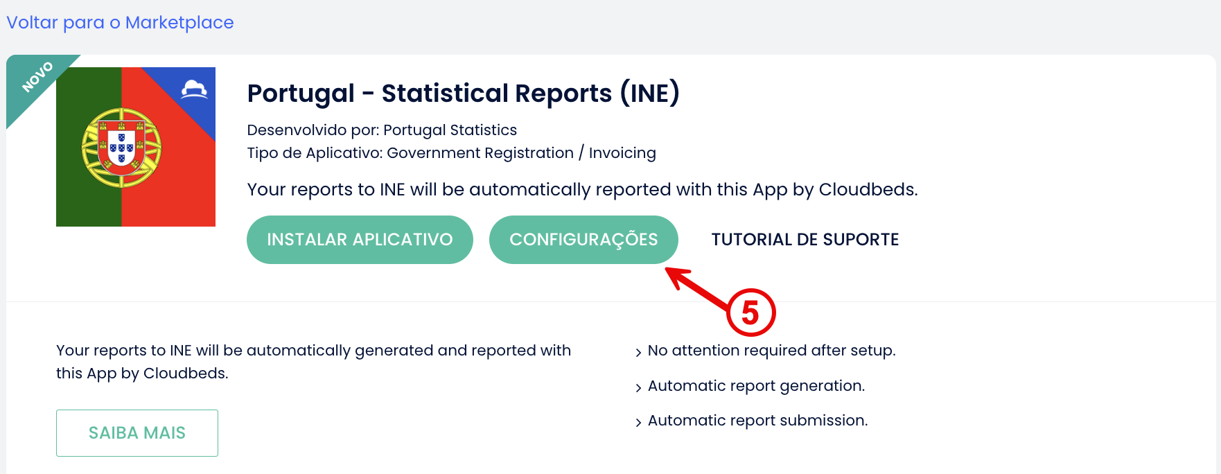 - Conecte o aplicativo Portugal Statistical Reports (INE) no Marketplace: Como Conectar um Aplicativo ao PMS da Cloudbeds;