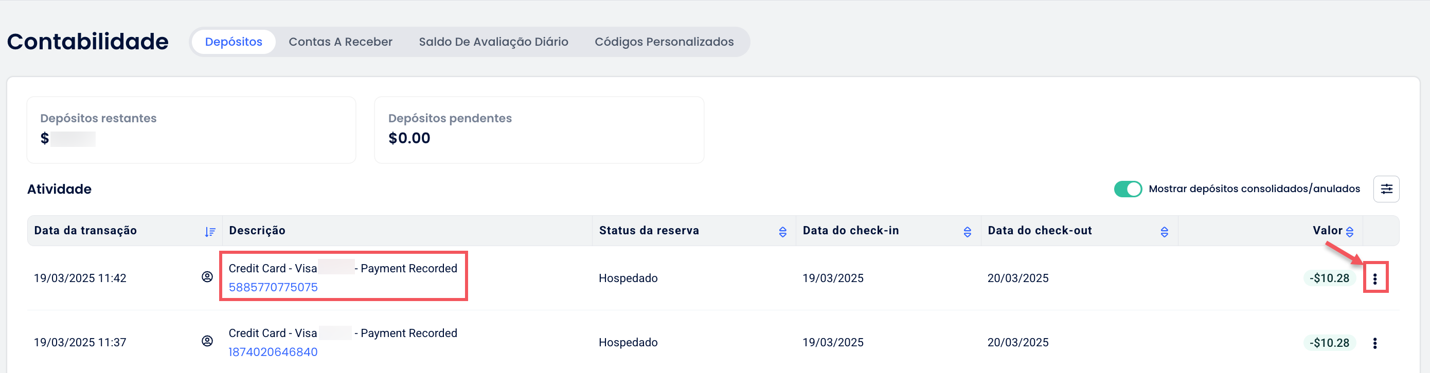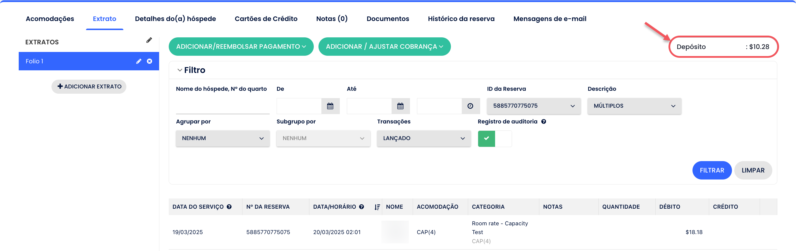 Ao navegar de volta para o extrato da reserva, você verá que o depósito foi adicionado às transações e o saldo restante do depósito será zero, o que significa que não há mais nenhum valor a ser cobrado como depósito para aquela reserva: