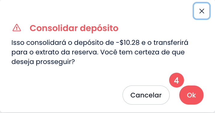 - Você receberá uma solicitação com os depósitos residuais e poderá consolidá-los como opção. Siga os passos em Gerencie os depósitos dentro do extrato da reserva para zerar o saldo do depósito;