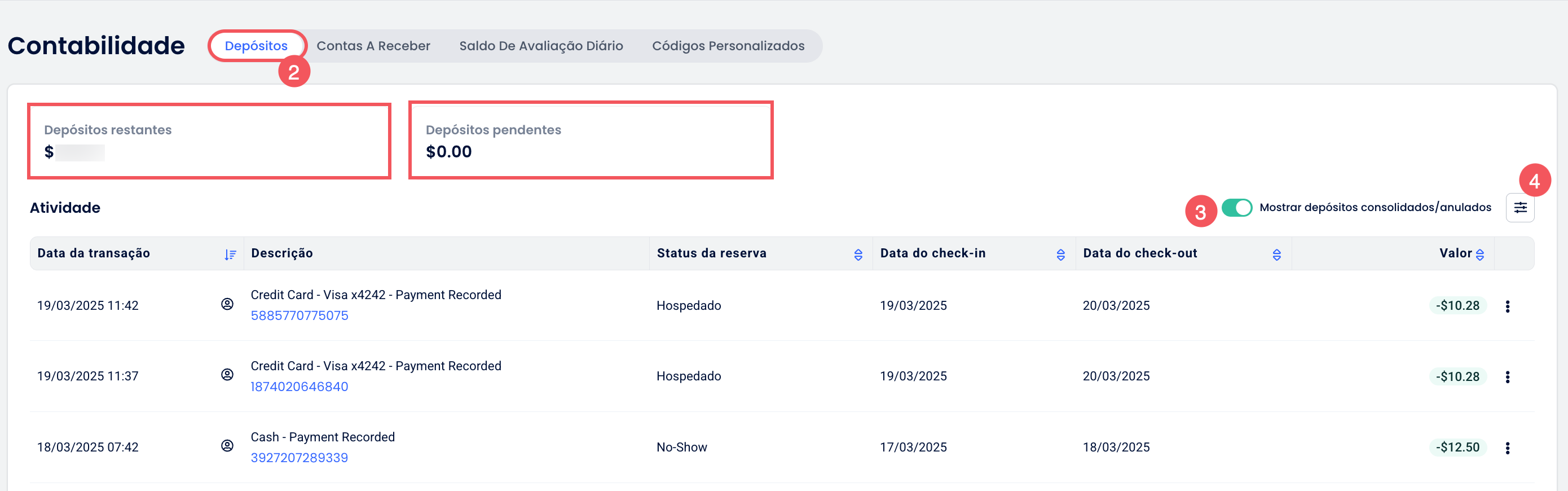- A função de depósito é restrita se o status da reserva for Check-out feito, No-show ou Cancelada.
