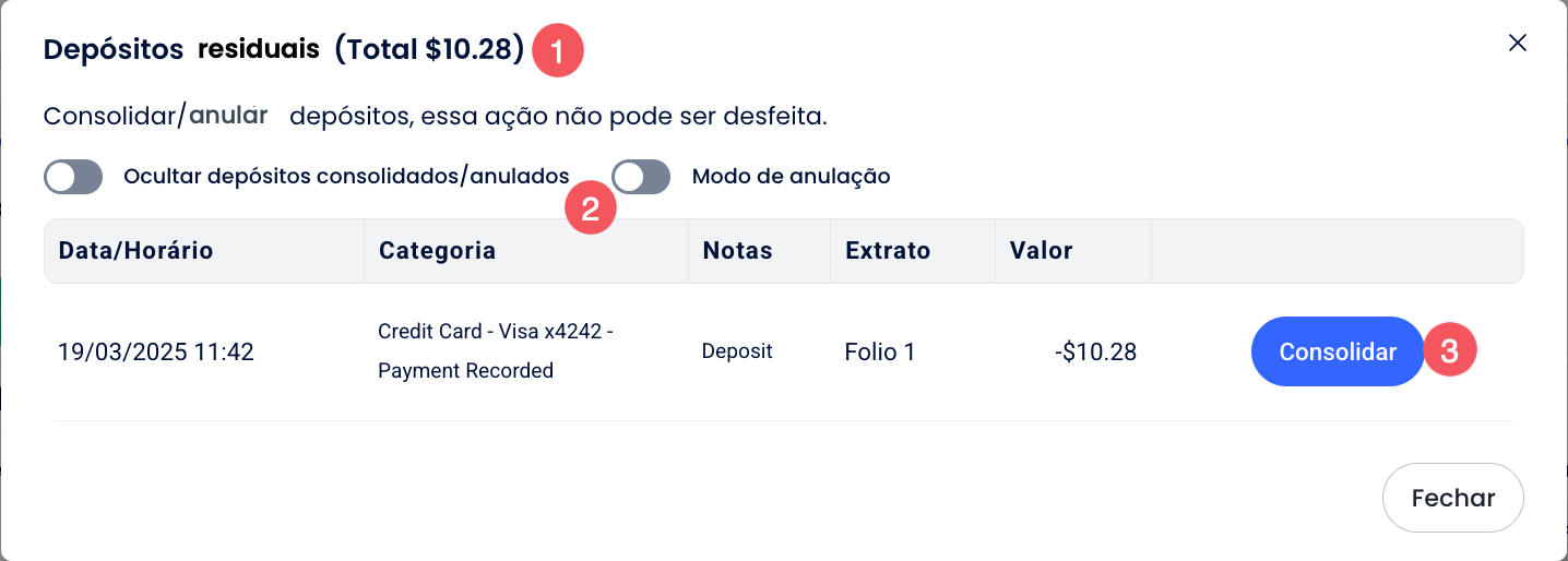 - Ao consolidar um depósito, ele será transferido do Razão de Depósitos e lançado no Registro contábil do hóspede (Extrato).