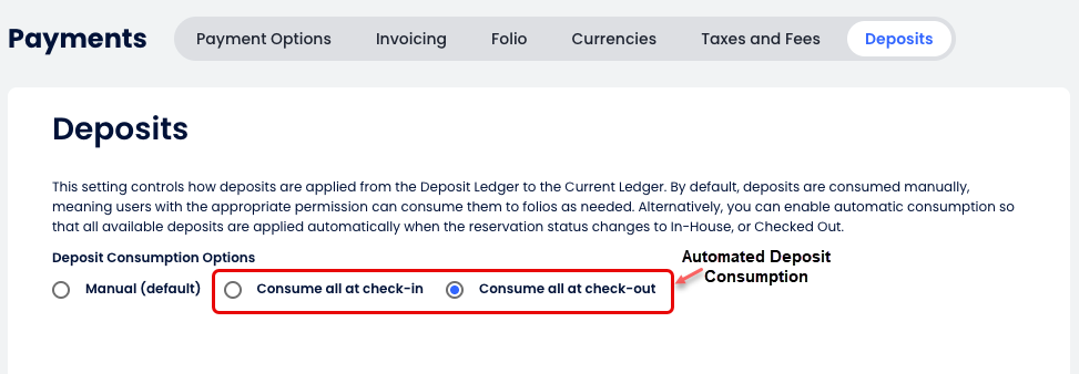 - Você pode ativar o recurso de consumação automática nas configurações de depósitos de Pagamentos