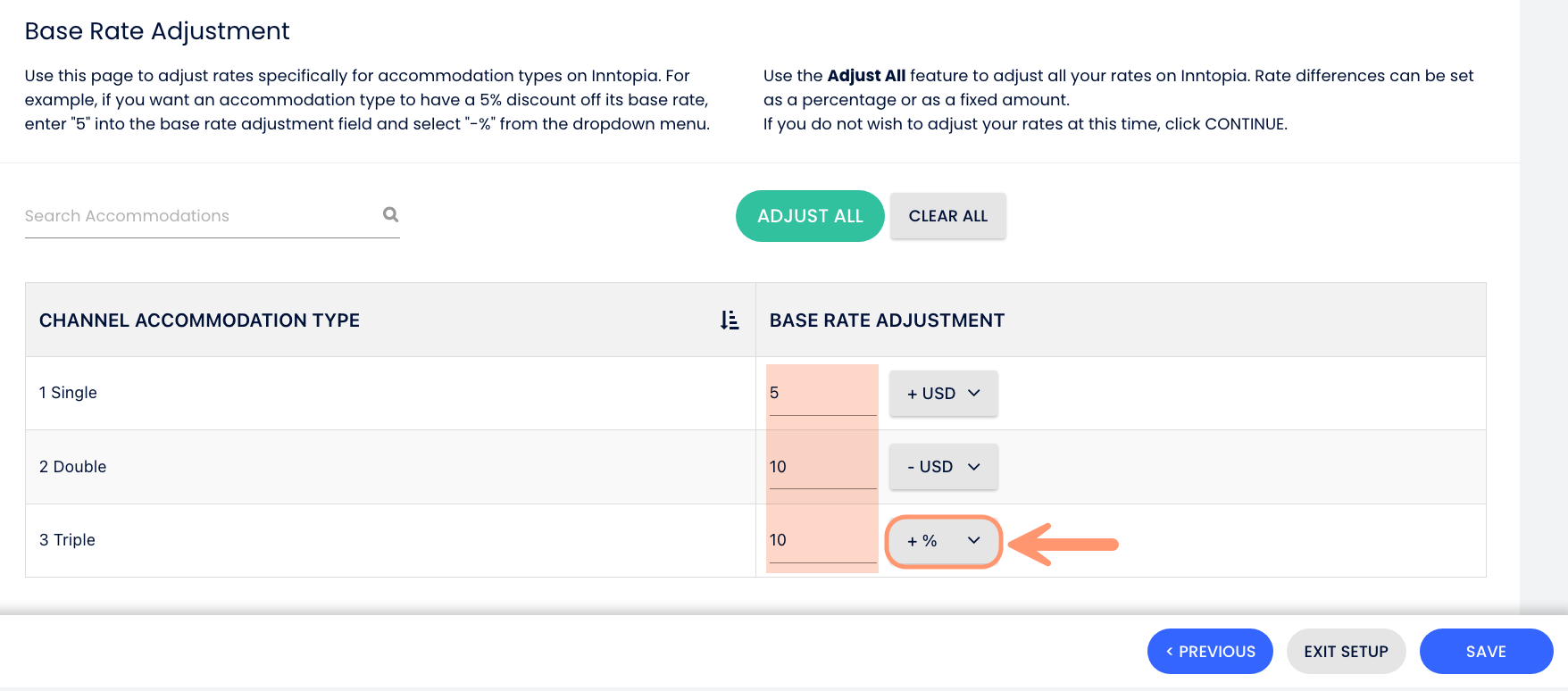 - Ajuste da tarifa base. Usuários da lógica padrão podem ajustar suas tarifas, aumentando ou diminuindo especificamente para a conexão com a Inntopia. Se fizer alterações, clique em Salvar; caso contrário, clique em Próximo Passo.