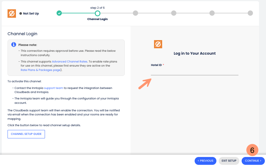 - Faça o logon com sua ID do Hotel do canal e clique em Continuar para prosseguir;
