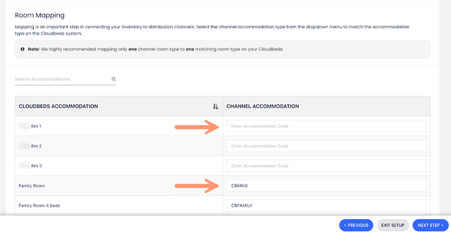 - Mapeamento dos Quartos: Insira o Código do Quarto da Inntopia na coluna Acomodação do canal para mapear os tipos de acomodação. Clique em Salvar e continue;