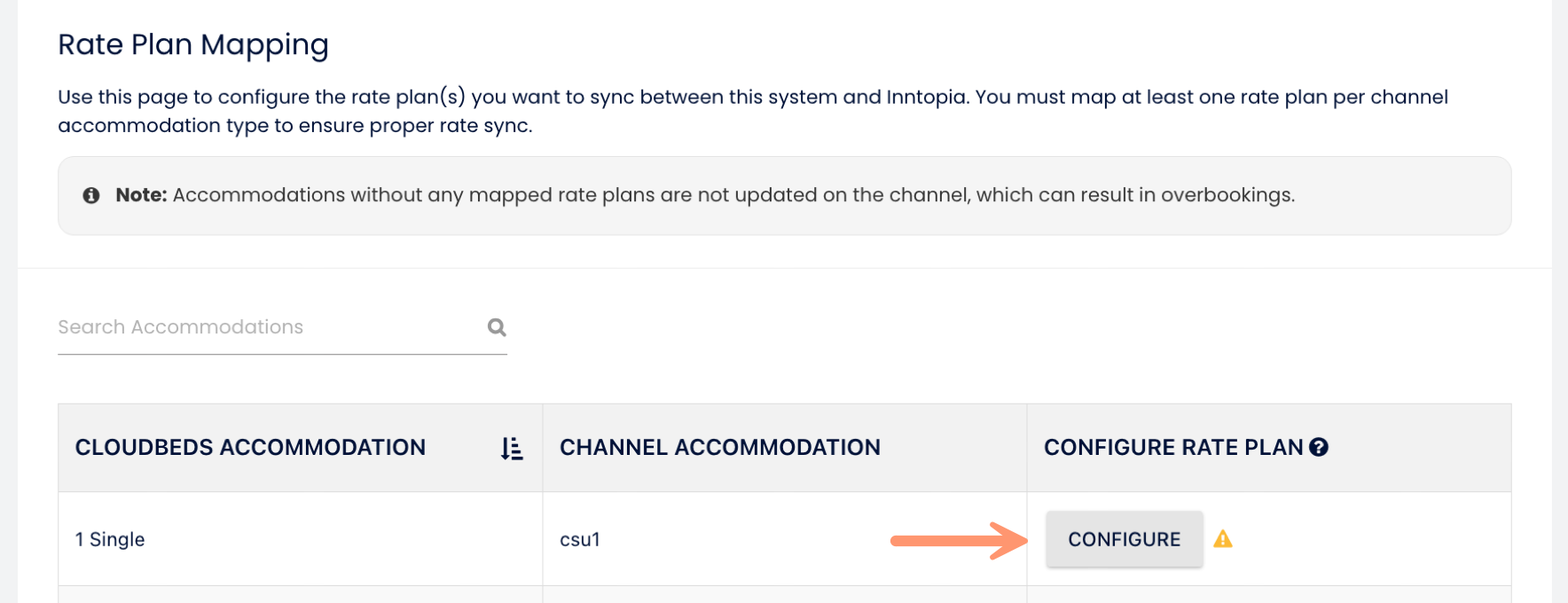 - Mapeamento do Plano Tarifário: Clique em Configurar para a acomodação no PMS da Cloudbeds escolhida. Insira o Código do Plano Tarifário da Inntopia no campo Plano Tarifário do canal, Salve e continue;