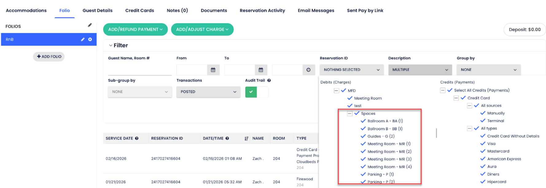 - Extratos de Grupo: Você pode lançar cobranças do Cloudbeds Spaces em um extrato de grupo, mas elas não podem ser removidas pela interface do extrato de grupo após o lançamento.