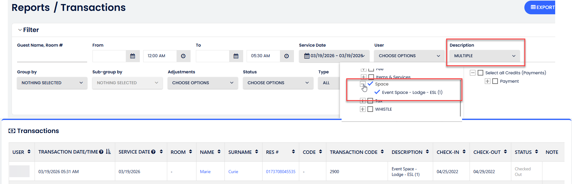 Lançamento no Extrato: As cobranças são lançadas no extrato como um valor único na data de início da reserva (aluguel de vários dias não é dividido diariamente). Você também pode usar filtros no Extrato para ver as informações relacionadas ao Cloudbeds Spaces:
