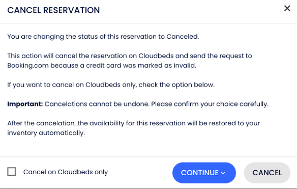 - Cancelamentos necessitam de status de cartão de crédito inválido – Para enviar uma solicitação de cancelamento através do PMS da Cloudbeds, a reserva deve primeiro ter o cartão de crédito marcado como inválido. Caso contrário, você deve cancelar a reserva manualmente na extranet da Booking.com antes de cancelar no PMS da Cloudbeds.