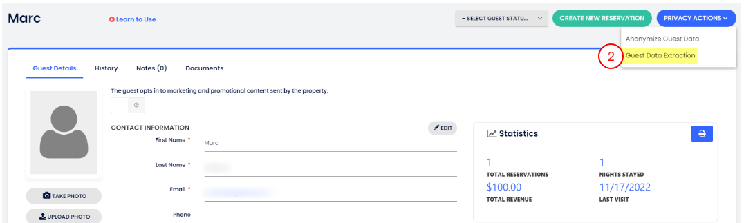 - No perfil do hóspede, clique no menu Ações de Privacidade e selecione a opção Extração de Dados do Hóspede. Os dados do hóspede serão baixados automaticamente para o seu computador em formato XML.